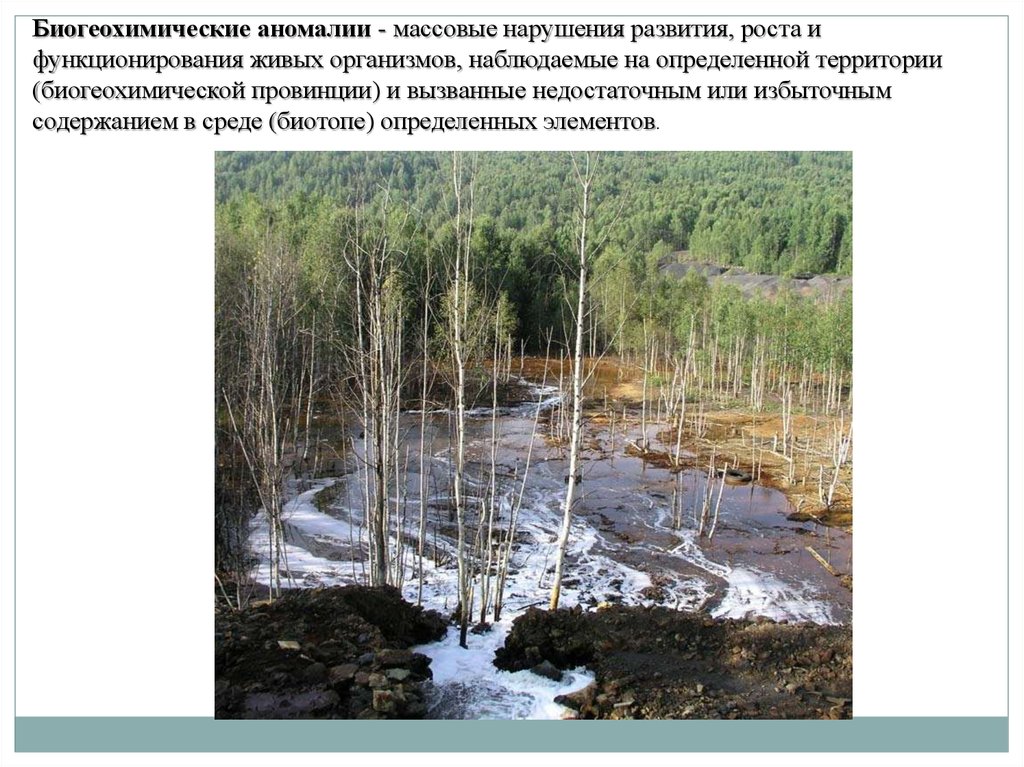 Биогеохимические аномалии - массовые нарушения развития, роста ифункционирования живых организмов, наблюдаемые на определенной территории