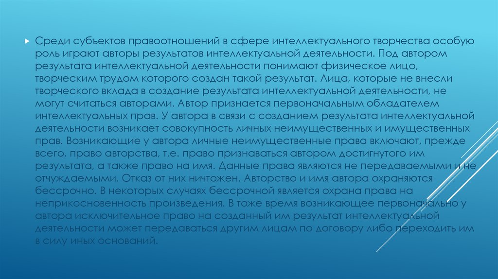 Среди субъектов правоотношений в сфере интеллектуального творчества особуюроль играют авторы результатов интеллектуальной деятельности. Под автором