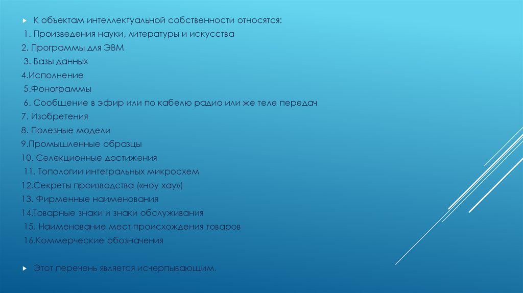 К объектам интеллектуальной собственности относятся:1. Произведения науки, литературы и искусства
