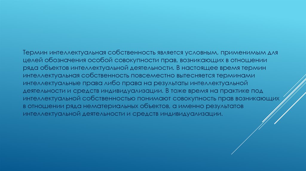 Термин интеллектуальная собственность является условным, применимым дляцелей обозначения особой совокупности прав, возникающих в отношении