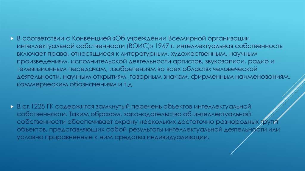 В соответствии с Конвенцией «Об учреждении Всемирной организацииинтеллектуальной собственности (ВОИС)» 1967 г. интеллектуальная собственность