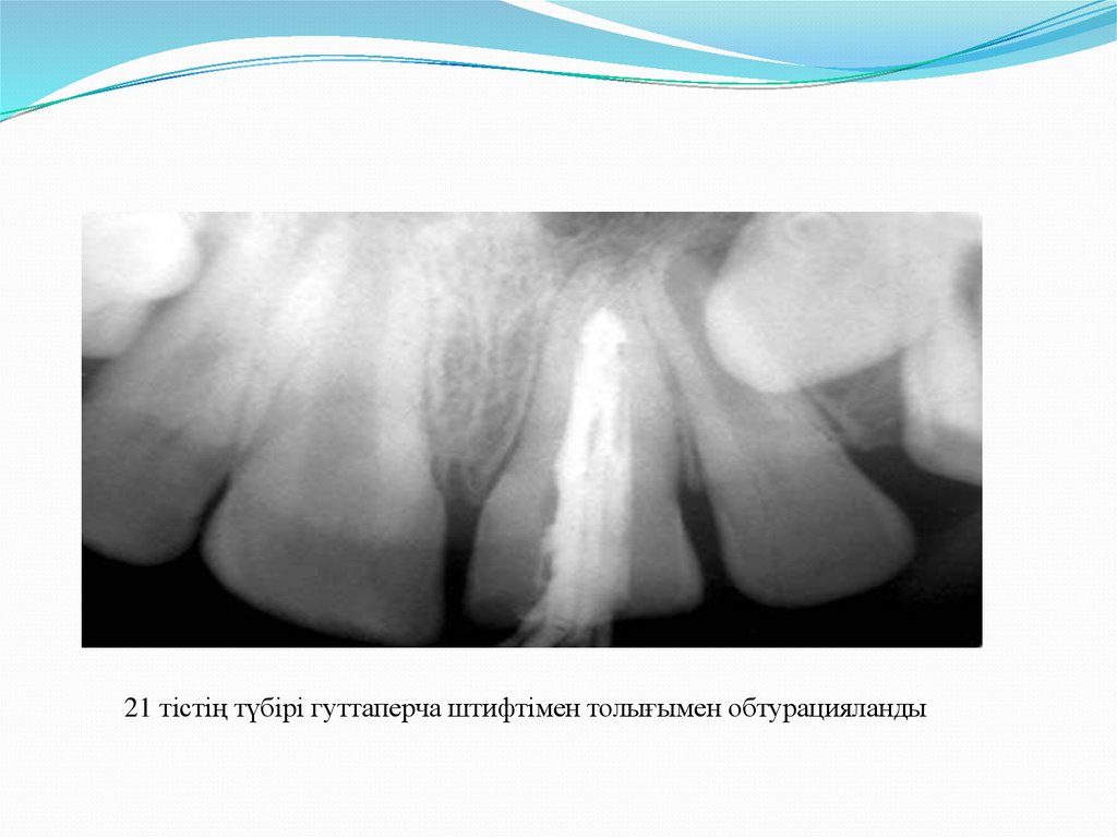 21 тістің түбірі гуттаперча штифтімен толығымен обтурацияланды12. Осылайша, түбірі жетілмеген тұрақты тістерді және өлген ұлпаны кальций сутотығымен емдеу, сәтті өтеді, ұзаққа созылатын нәтиже