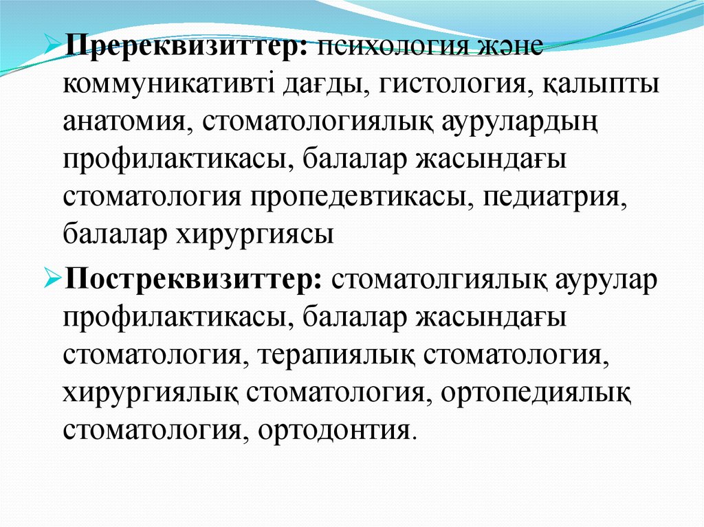 Пререквизиттер: психология жәнекоммуникативті дағды, гистология, қалыпты