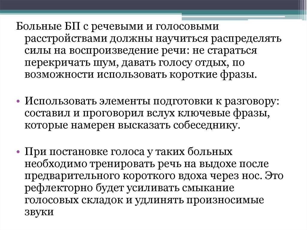 Больные БП с речевыми и голосовымирасстройствами должны научиться распределять