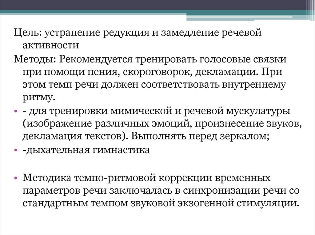 Цель: устранение редукция и замедление речевойактивности