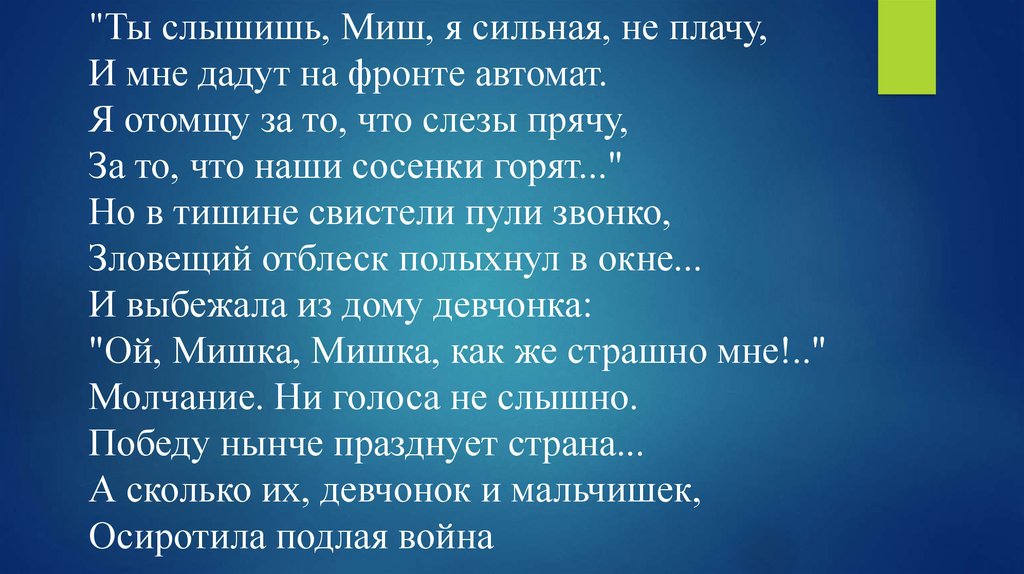 "Ты слышишь, Миш, я сильная, не плачу,И мне дадут на фронте автомат.