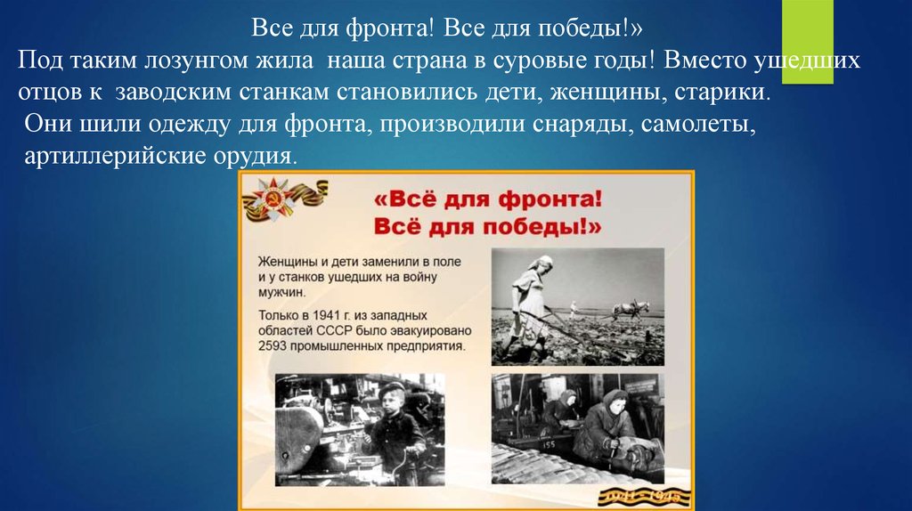 Все для фронта! Все для победы!»Под таким лозунгом жила наша страна в суровые годы! Вместо ушедших