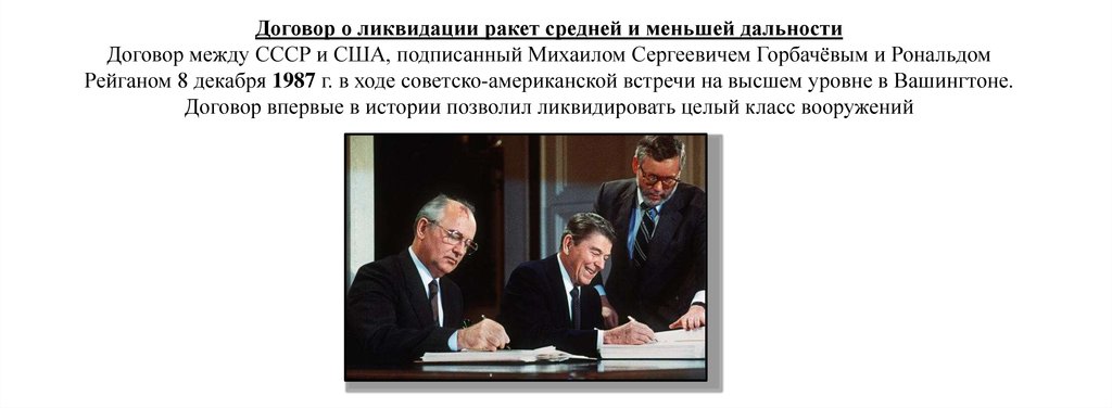 Договор о ликвидации ракет средней и меньшей дальностиДоговор между СССР и США, подписанный Михаилом Сергеевичем Горбачёвым и Рональдом