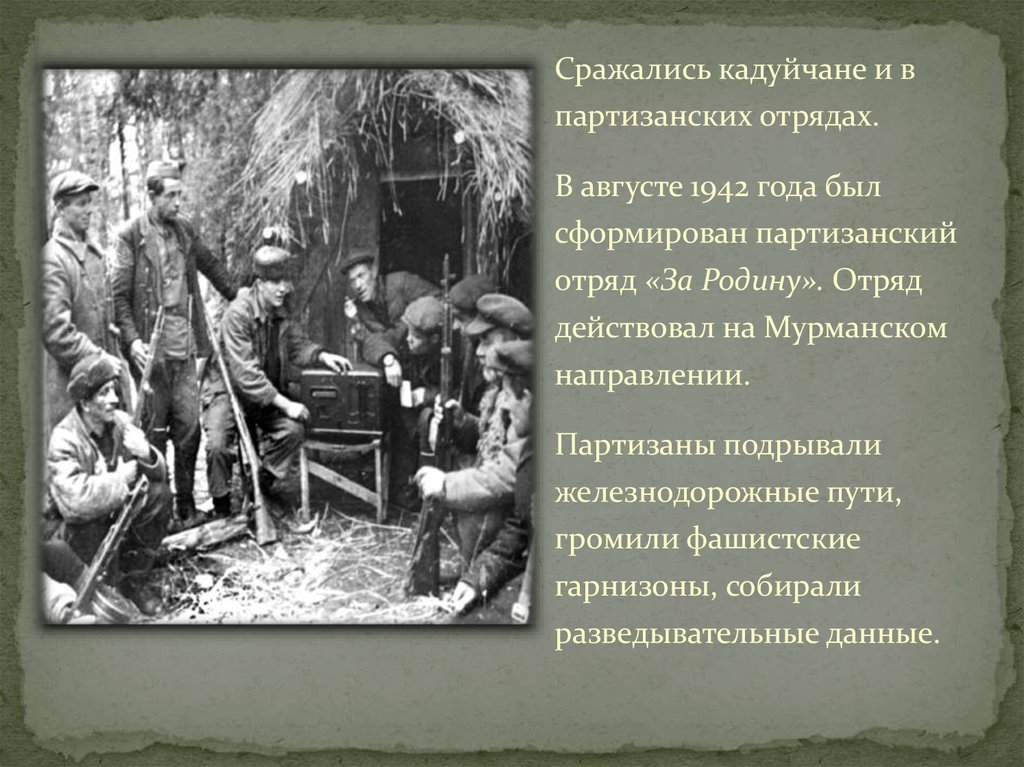3. За все годы войны из Кадуйского района ушло в Красную Армию свыше 6000 человек. 24 и 25 июня 1941 года Кадуй провожал первую
