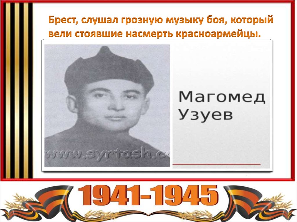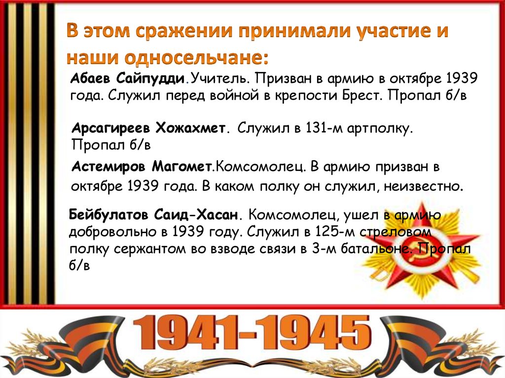 Абаев Сайпудди.Учитель. Призван в армию в октябре 1939года. Служил перед войной в крепости Брест. Пропал б/в