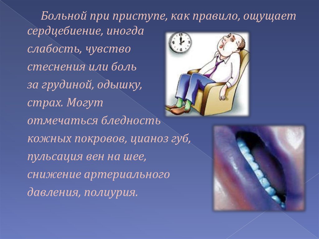 Больной при приступе, как правило, ощущаетсердцебиение, иногда