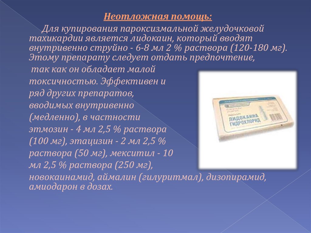 препаратом выбора является лидокаин. Начальную дозу 4-6 мл 2 % раствора (80- 120 мг) вводят внутривенно