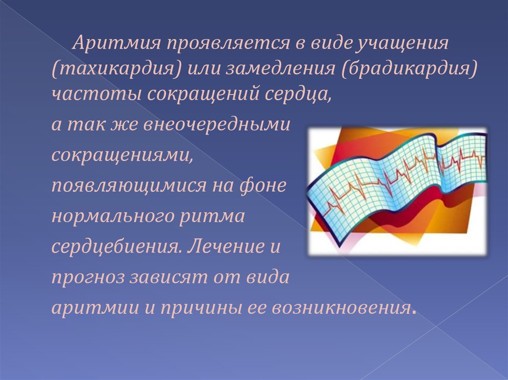 Аритмия проявляется в виде учащения(тахикардия) или замедления (брадикардия)