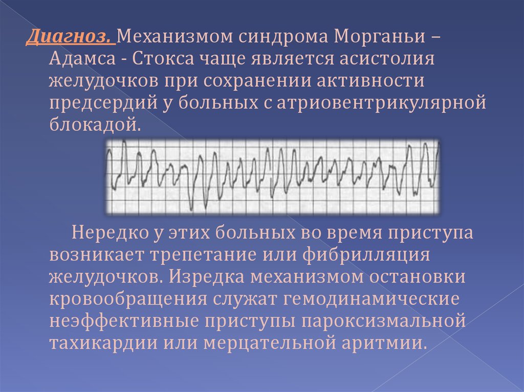 Диагноз. Механизмом синдрома Морганьи –Адамса - Стокса чаще является асистолия