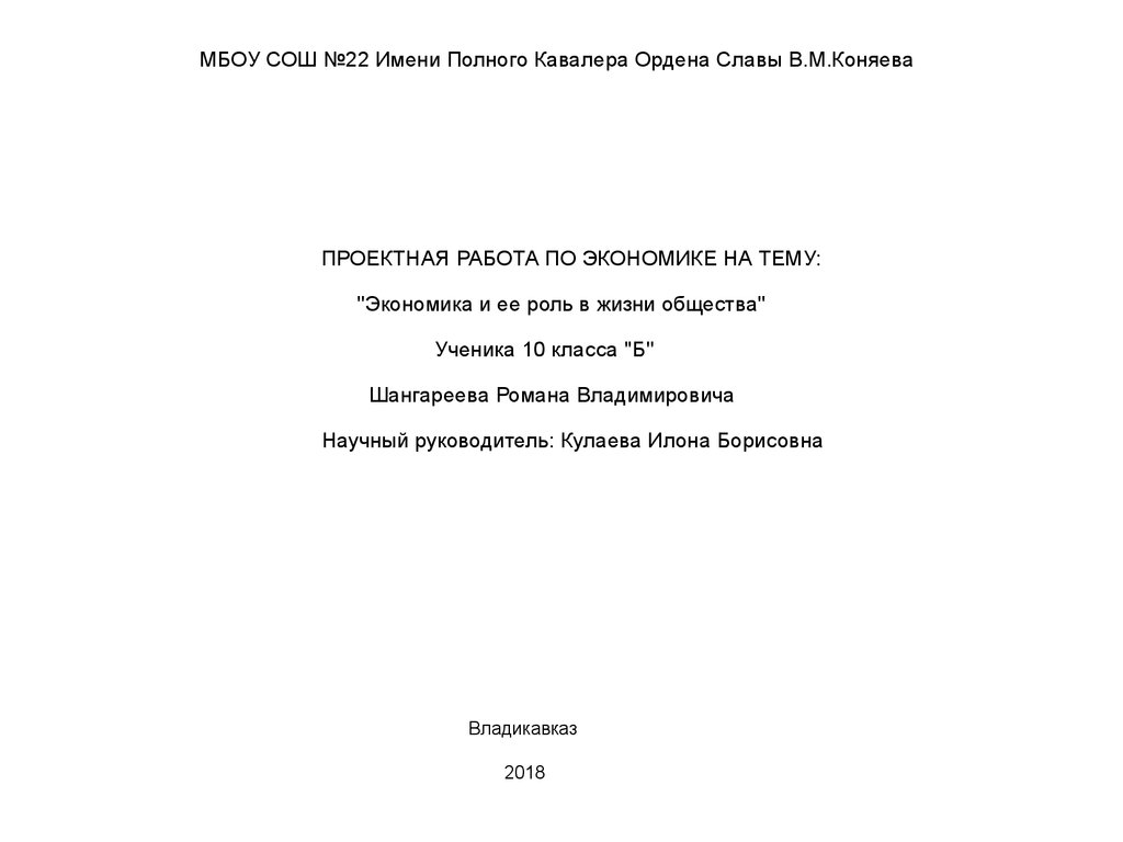 МБОУ СОШ №22 Имени Полного Кавалера Ордена Славы В.М.КоняеваПРОЕКТНАЯ РАБОТА ПО ЭКОНОМИКЕ НА ТЕМУ: