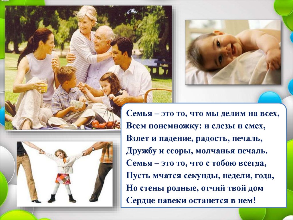 Семья – это то, что мы делим на всех,Всем понемножку: и слезы и смех,