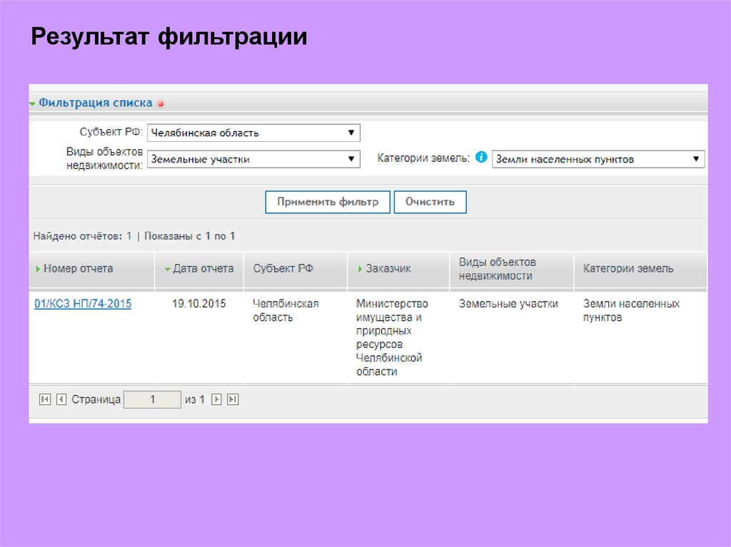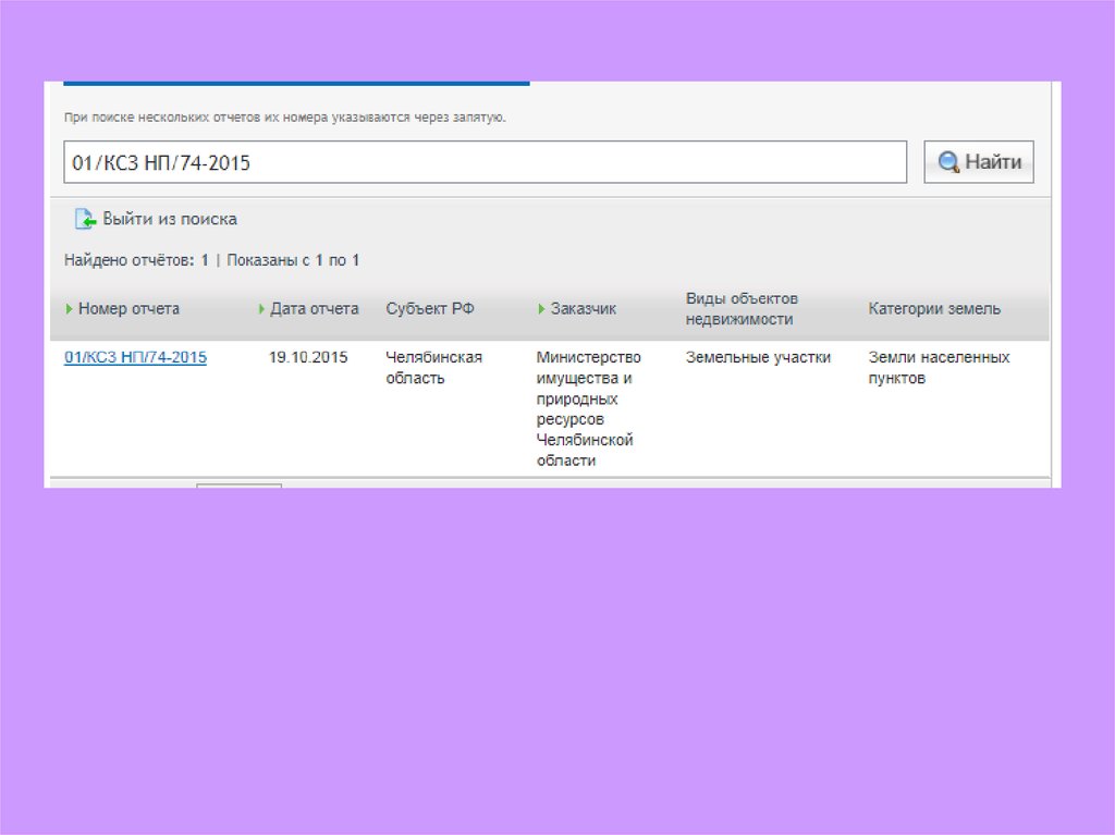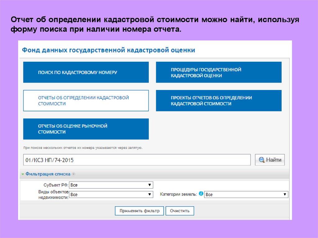 Отчет об определении кадастровой стоимости можно найти, используяформу поиска при наличии номера отчета.