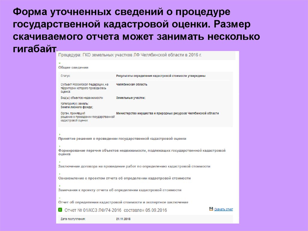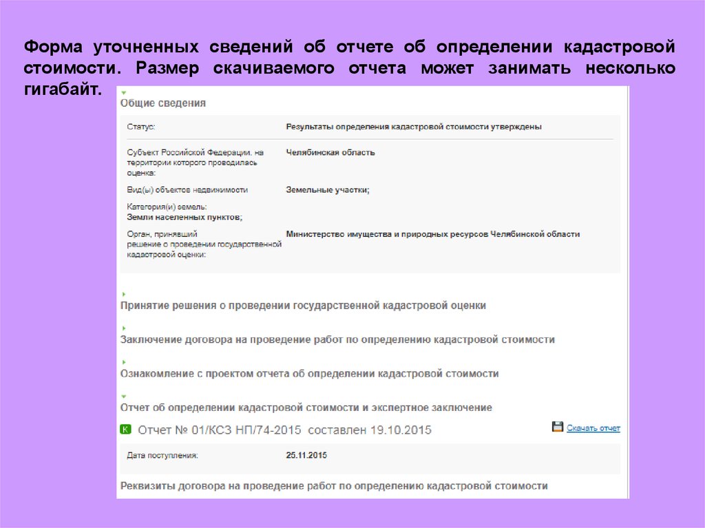 Форма уточненных сведений об отчете об определении кадастровойстоимости. Размер скачиваемого отчета может занимать несколько