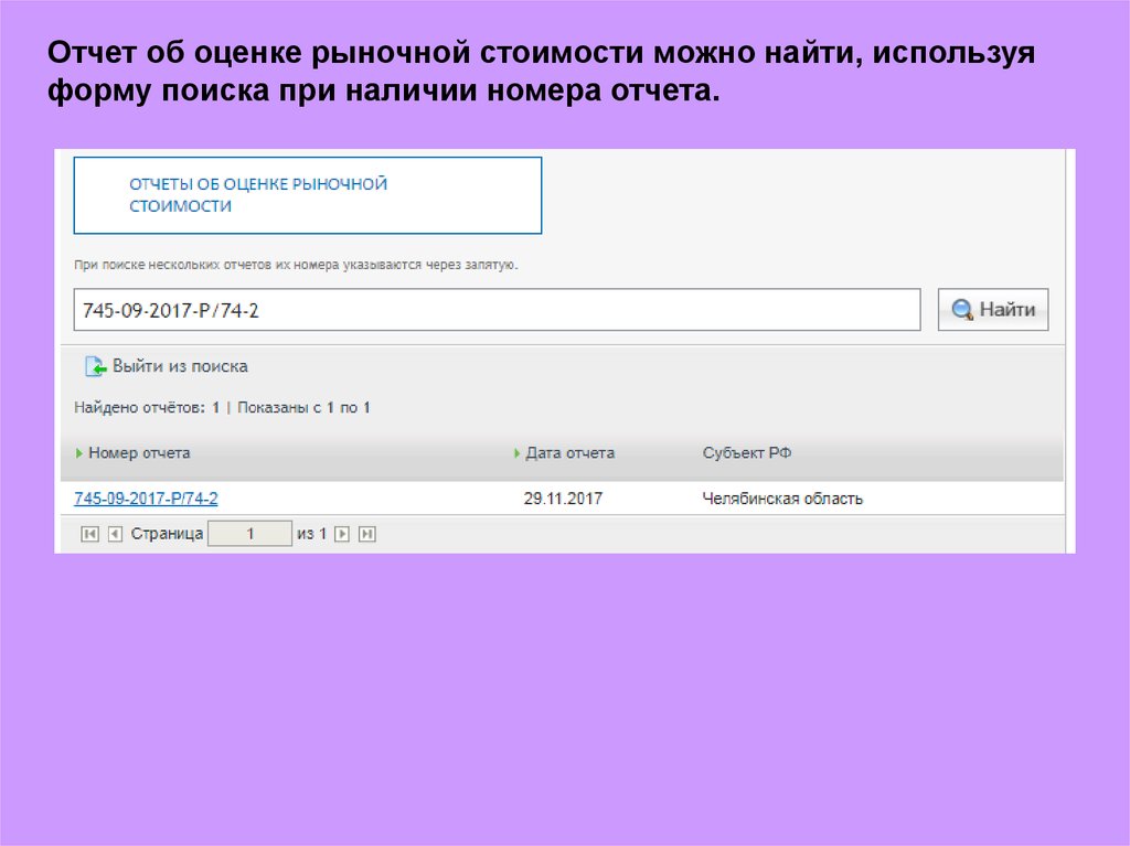 Отчет об оценке рыночной стоимости можно найти, используяформу поиска при наличии номера отчета.