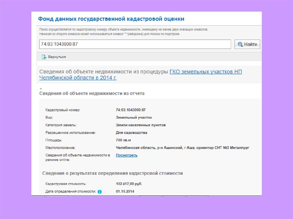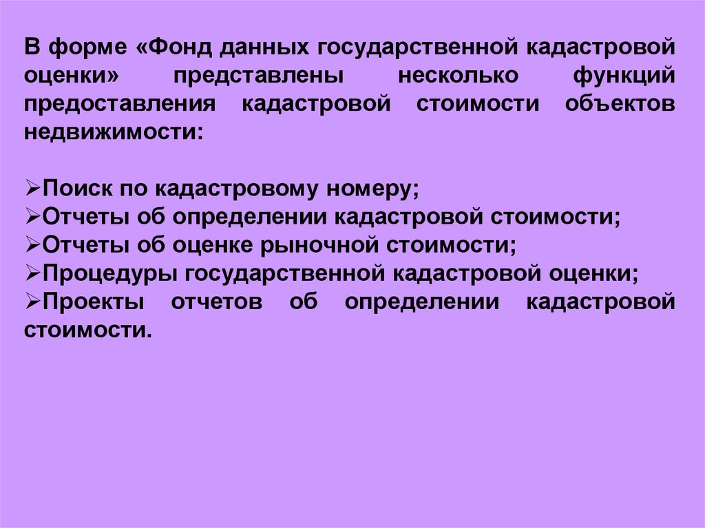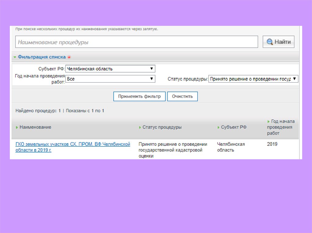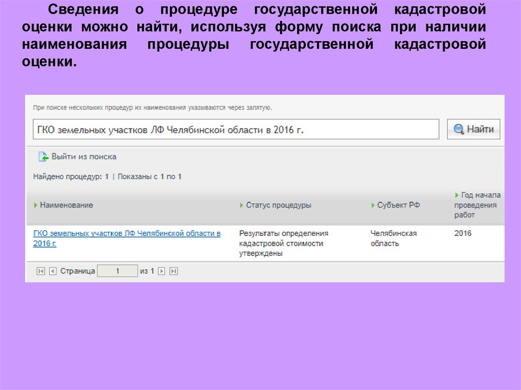 Сведения о процедуре государственной кадастровойоценки можно найти, используя форму поиска при наличии