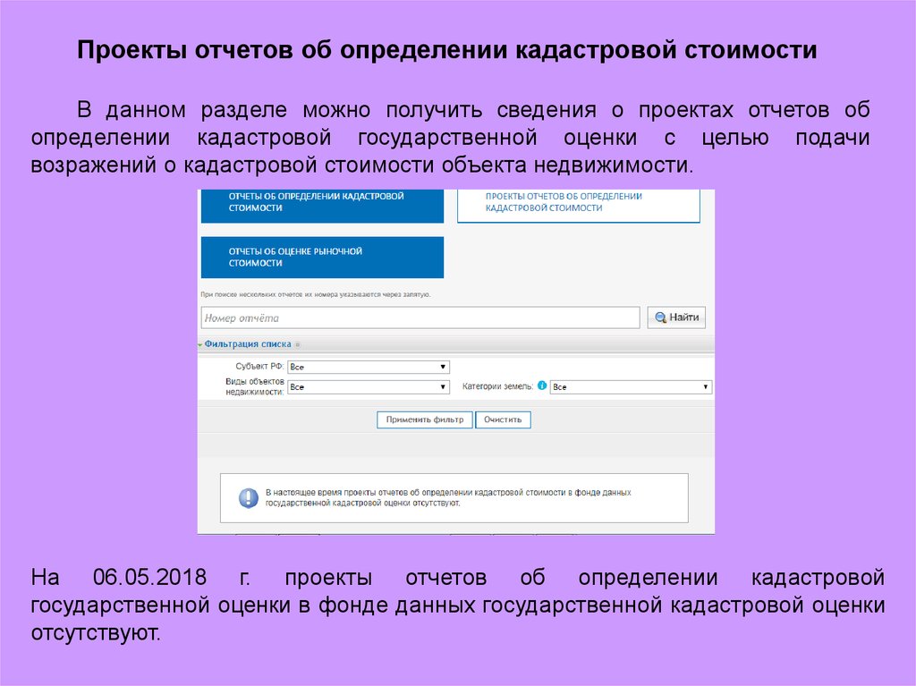 Проекты отчетов об определении кадастровой стоимостиВ данном разделе можно получить сведения о проектах отчетов об