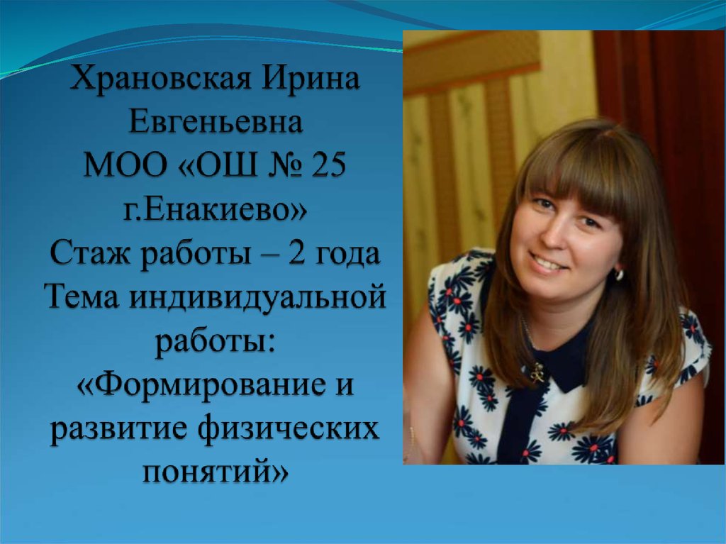 1. Храновская Ирина Евгеньевна МОО «ОШ № 25 г.Енакиево» Стаж работы – 2 года Тема индивидуальной работы: «Формирование и развитие