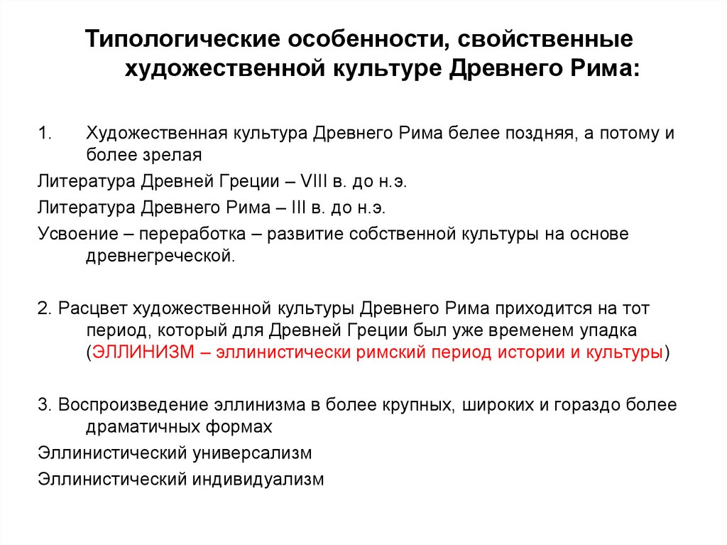 Типологические особенности, свойственныехудожественной культуре Древнего Рима: