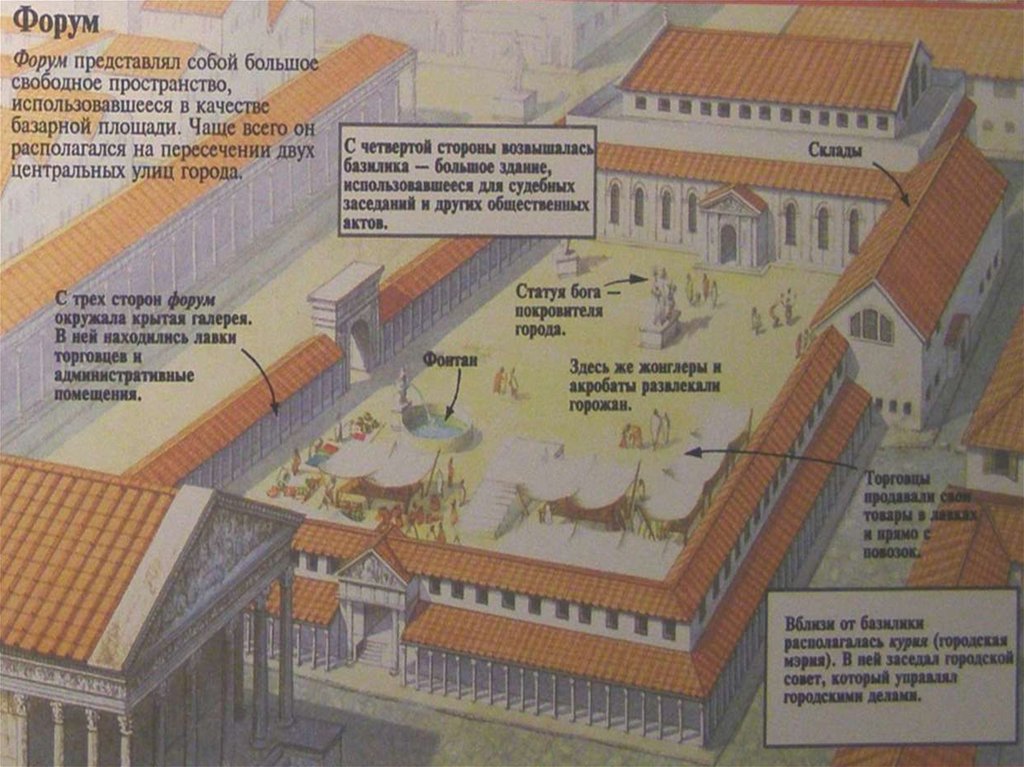 12. Нерегулярную планировку III в. до.н.э. упорядочили во 2 в. до.н.э. окружив форум с трех сторон портиками. В 1 в. до н.э. за