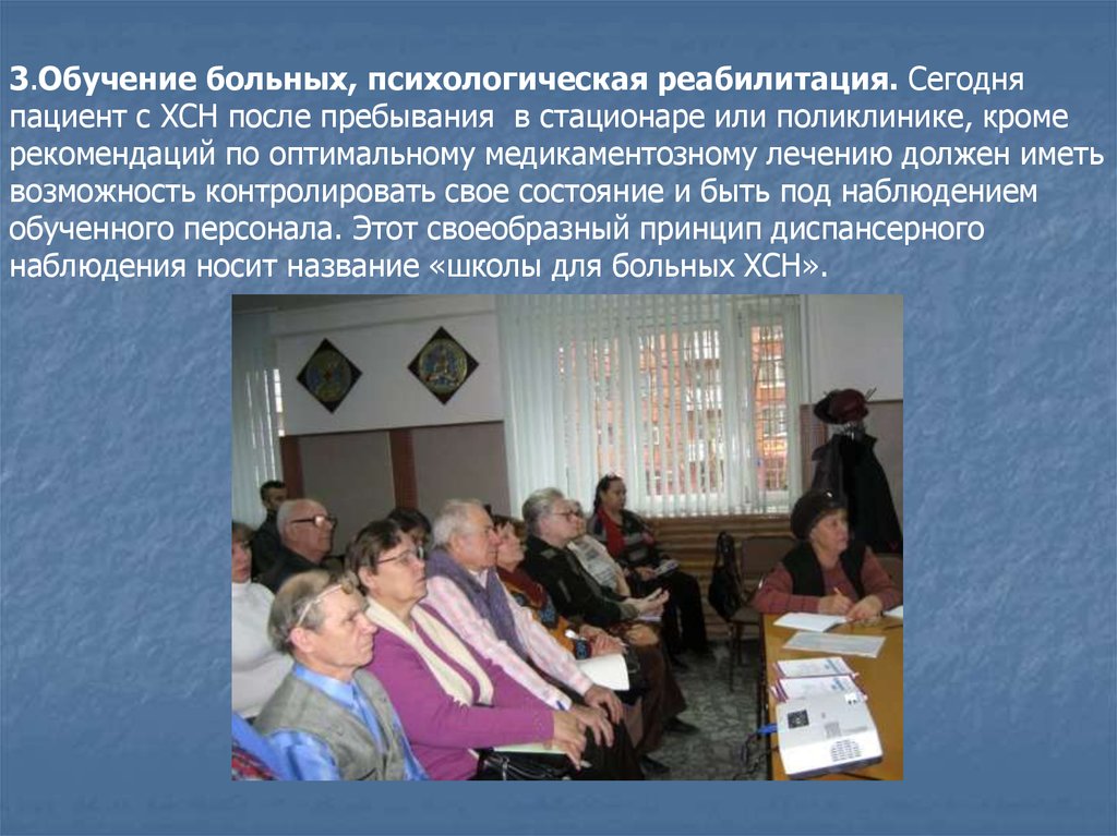 3.Обучение больных, психологическая реабилитация. Сегодняпациент с ХСН после пребывания в стационаре или поликлинике, кроме