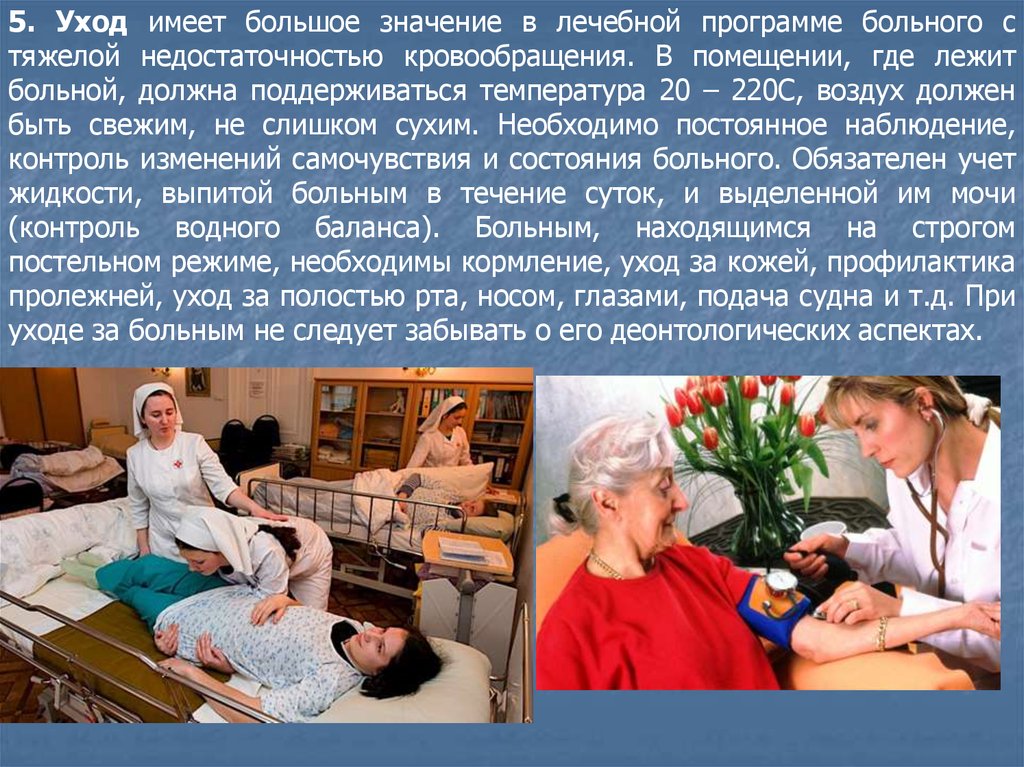 5. Уход имеет большое значение в лечебной программе больного стяжелой недостаточностью кровообращения. В помещении, где лежит