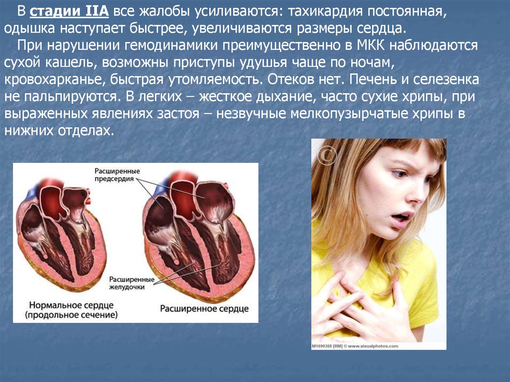 В стадии IIА все жалобы усиливаются: тахикардия постоянная,одышка наступает быстрее, увеличиваются размеры сердца.