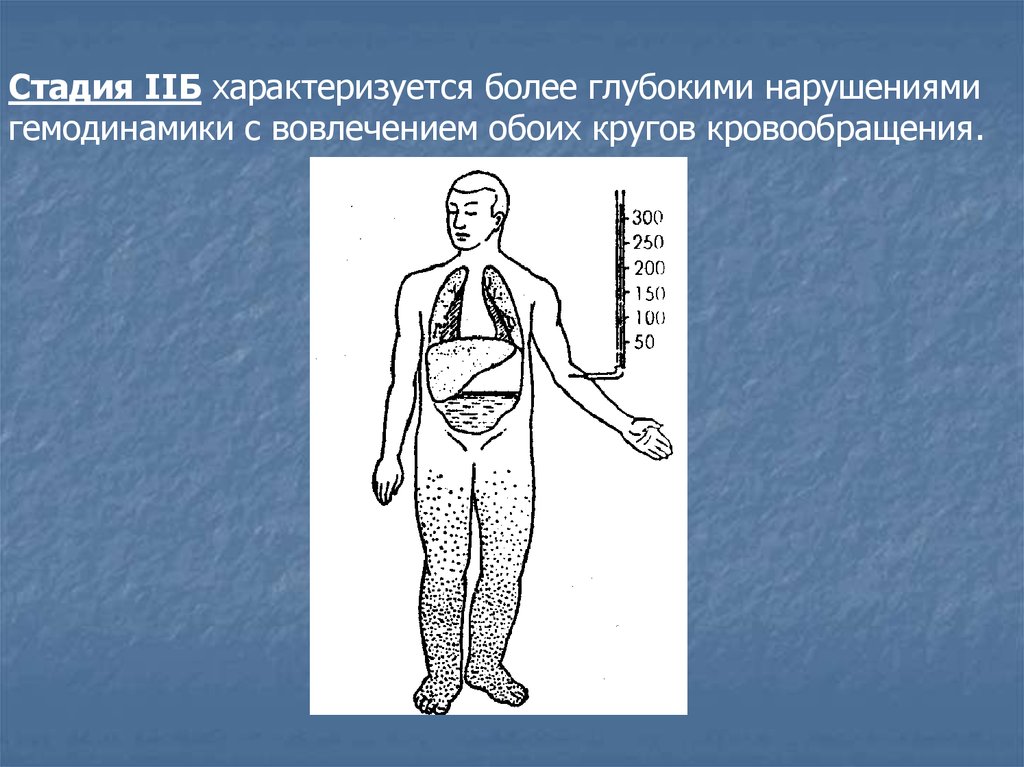 Стадия IIБ характеризуется более глубокими нарушениямигемодинамики с вовлечением обоих кругов кровообращения.