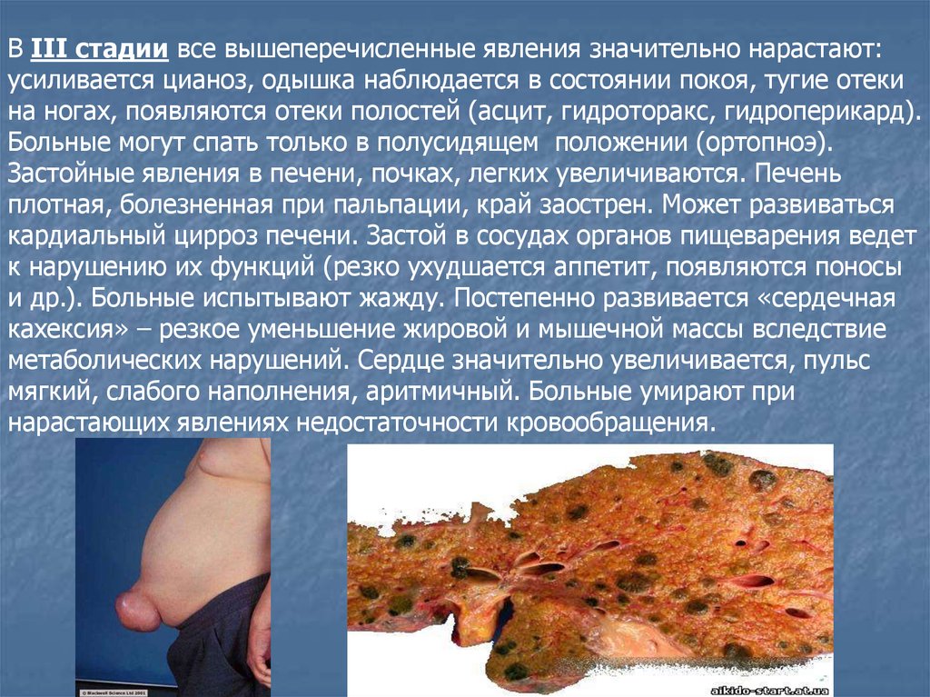 Застойные явления в печени, почках, легких увеличиваются. Печень