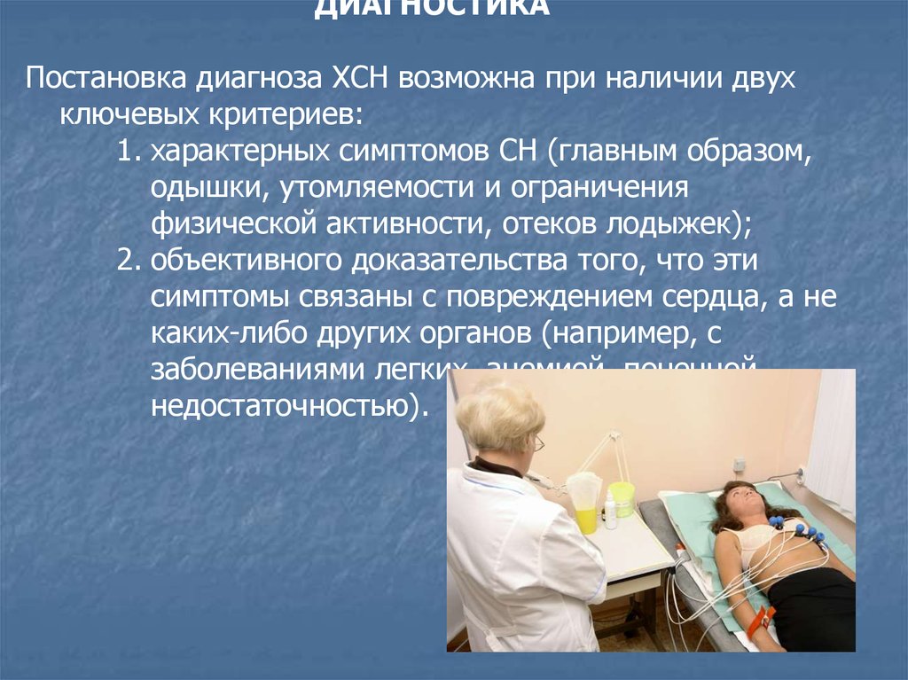 ДИАГНОСТИКАПостановка диагноза ХСН возможна при наличии двух