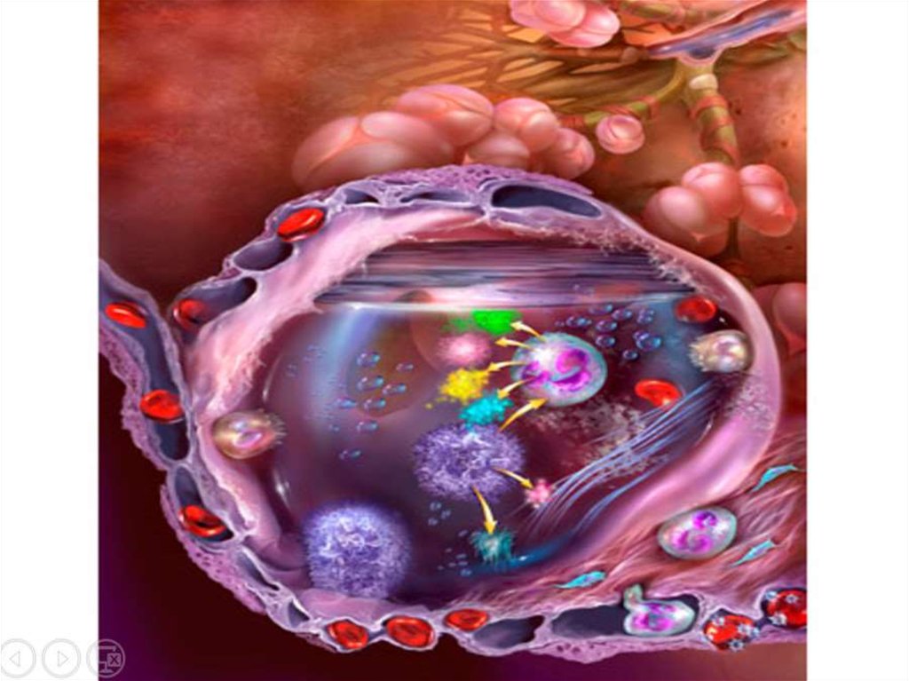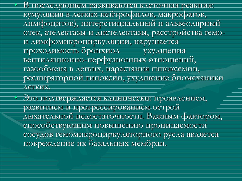 • В последующем развиваются клеточная реакция:кумуляция в легких нейтрофилов, макрофагов,