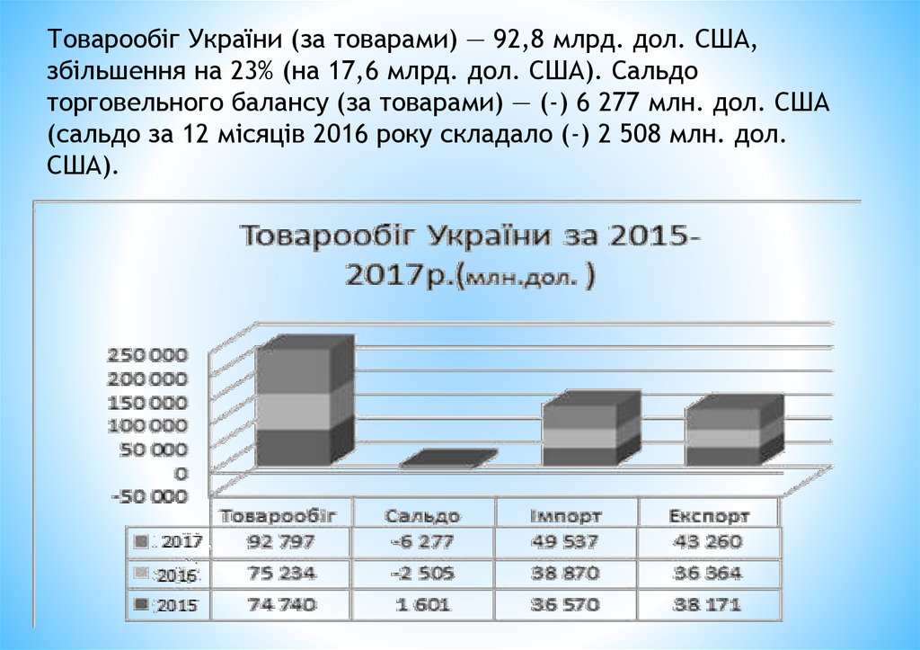 Товарообіг України (за товарами) — 92,8 млрд. дол. США,збільшення на 23% (на 17,6 млрд. дол. США). Сальдо