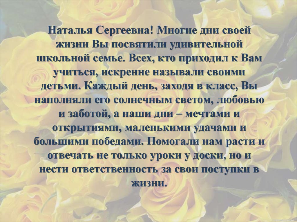 Наталья Сергеевна! Многие дни своейжизни Вы посвятили удивительной