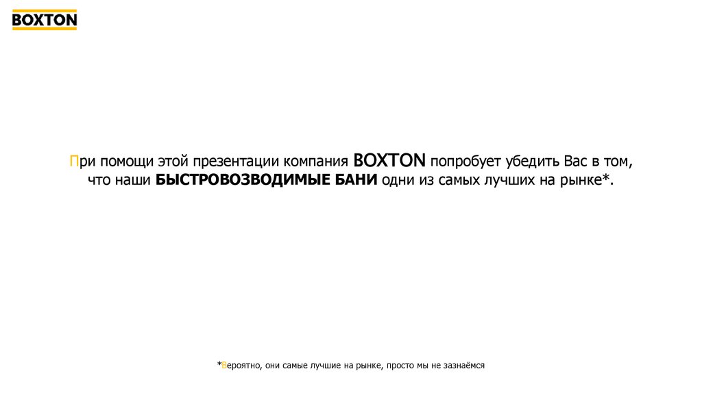 1. При помощи этой презентации компания BOXTON попробует убедить Вас в том, что наши БЫСТРОВОЗВОДИМЫЕ БАНИ одни из самых лучших на