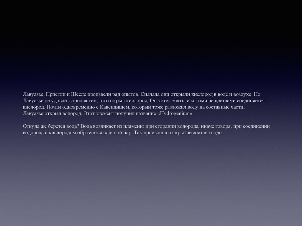 Лавуазье, Пристли и Шееле произвели ряд опытов. Сначала они открыли кислород в воде и воздухе. НоЛавуазье не удовлетворился тем, что открыл кислород. Он хотел знать, с какими веществами соединяется