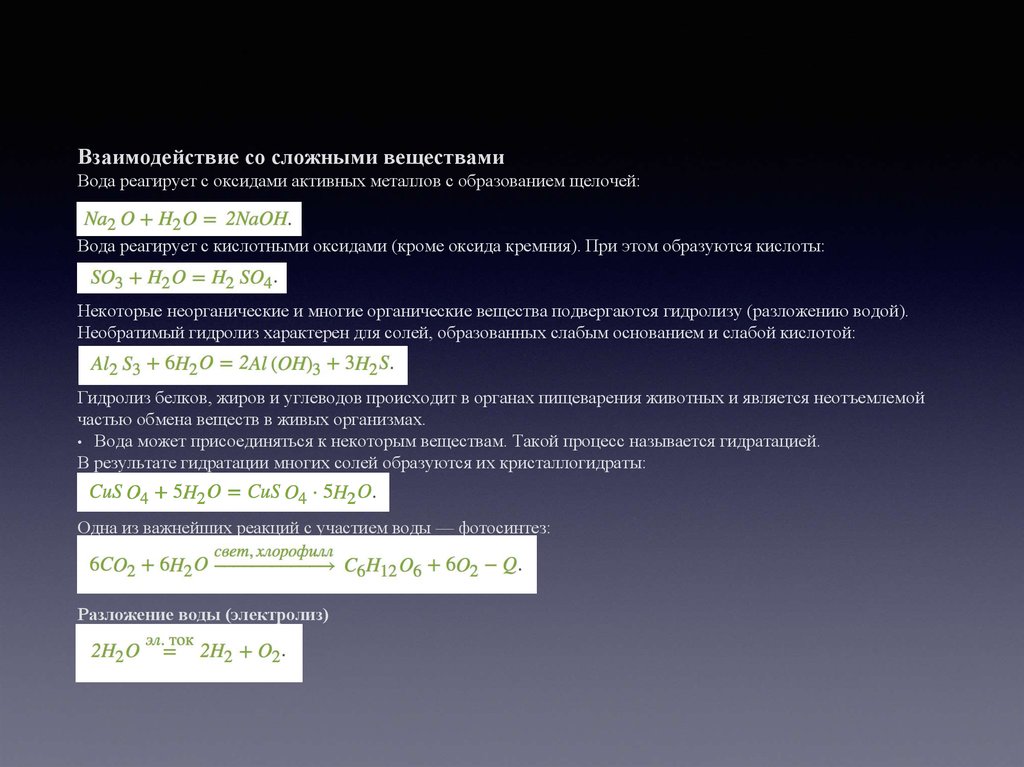 Взаимодействие со сложными веществамиВода реагирует с оксидами активных металлов с образованием щелочей: