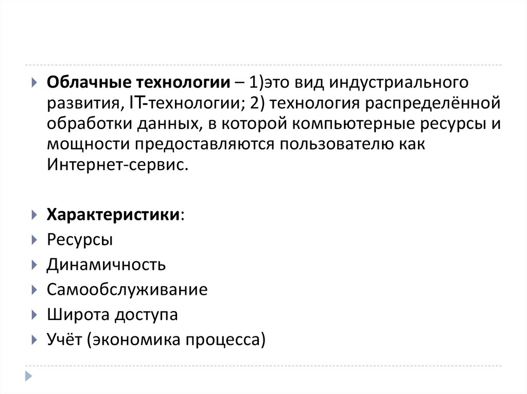 Облачные технологии – 1)это вид индустриальногоразвития, IT-технологии; 2) технология распределённой
