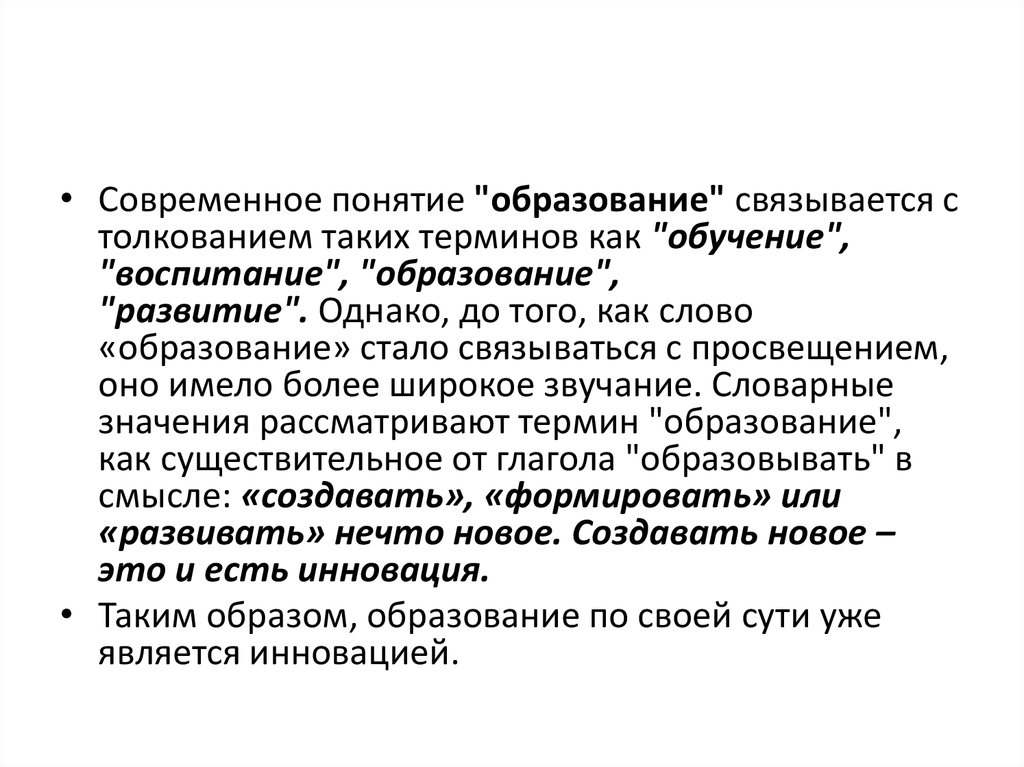 • Современное понятие "образование" связывается столкованием таких терминов как "обучение",