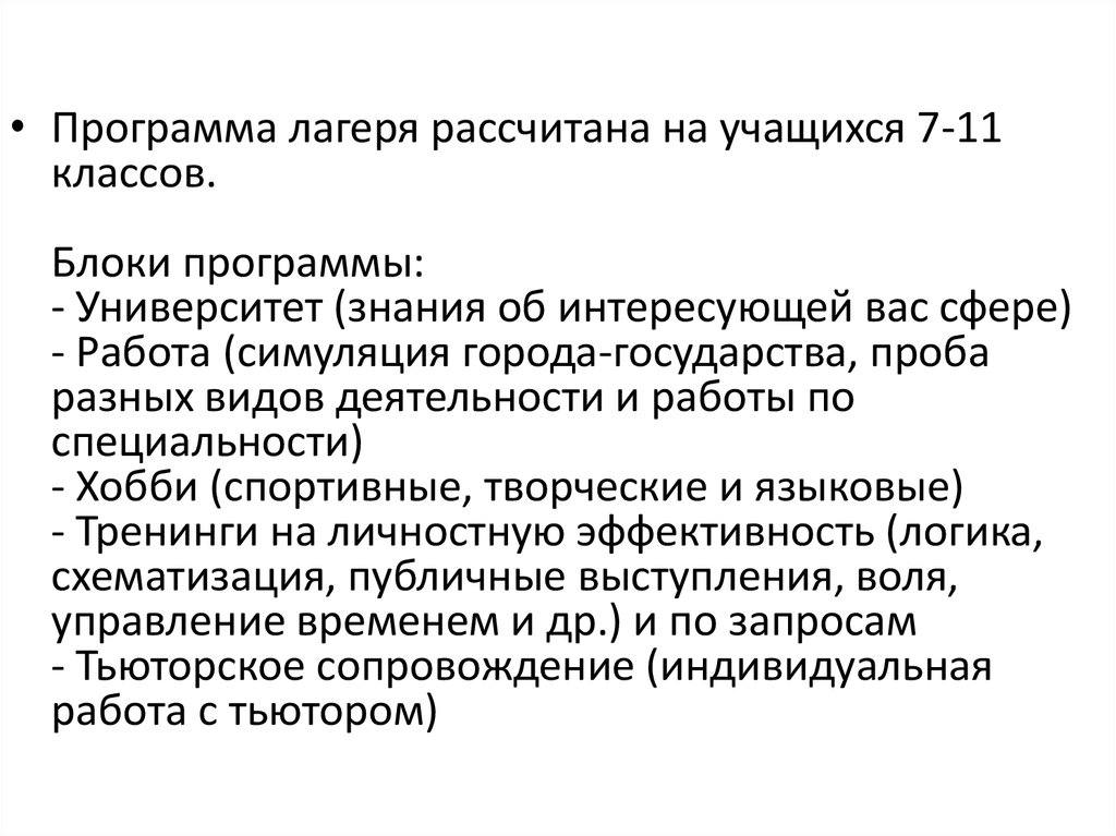 • Программа лагеря рассчитана на учащихся 7-11классов.