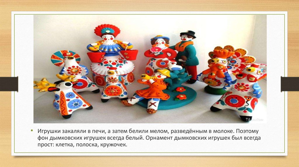 • Игрушки закаляли в печи, а затем белили мелом, разведённым в молоке. Поэтомуфон дымковских игрушек всегда белый. Орнамент дымковских игрушек был всегда