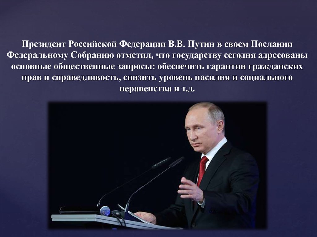 Президент Российской Федерации В.В. Путин в своем ПосланииФедеральному Собранию отметил, что государству сегодня адресованы