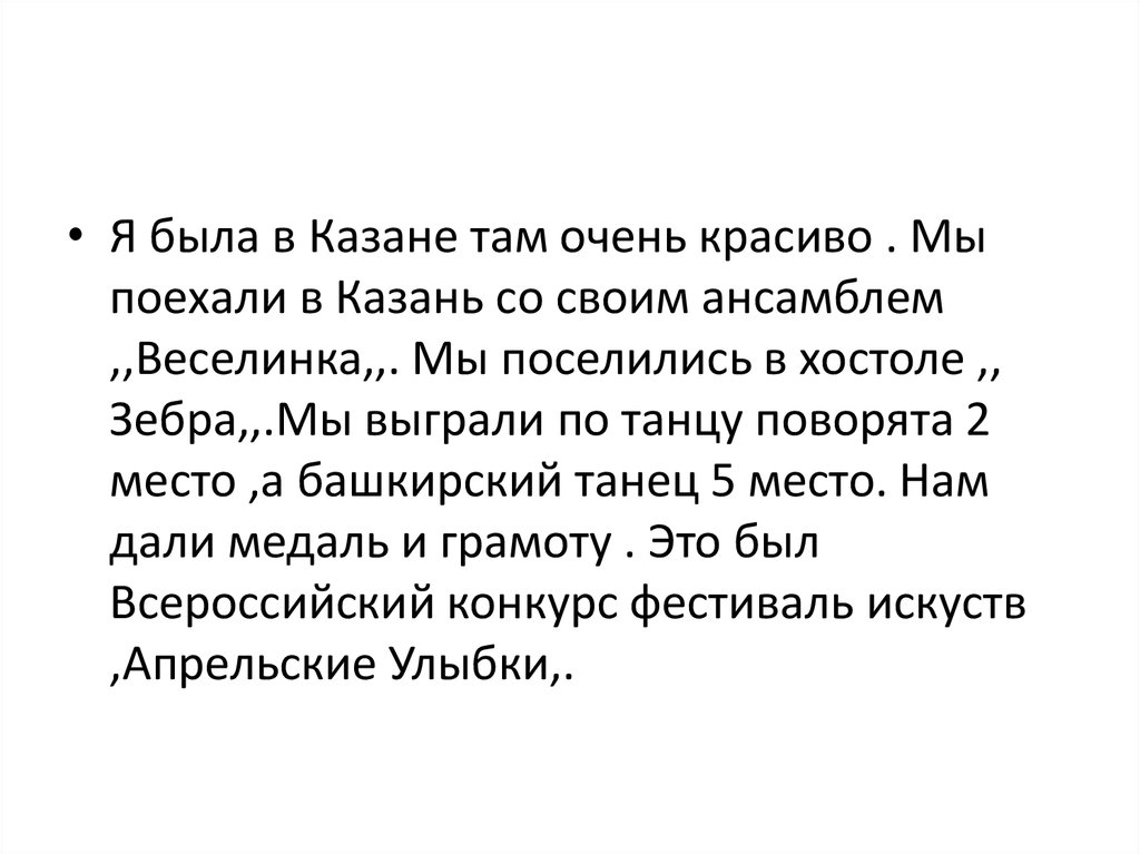 • Я была в Казане там очень красиво . Мыпоехали в Казань со своим ансамблем