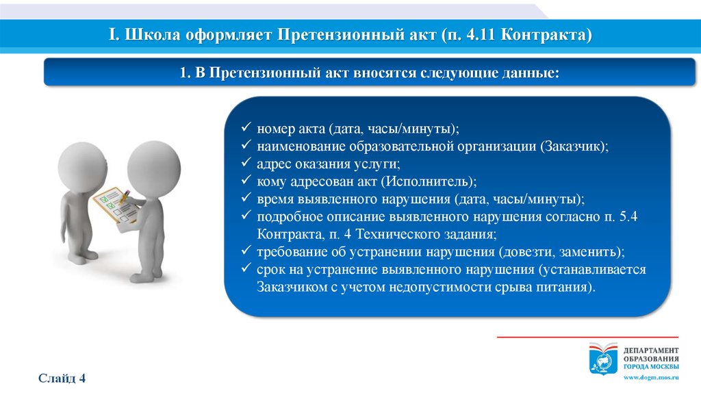 I. Школа оформляет Претензионный акт (п. 4.11 Контракта)1. В Претензионный акт вносятся следующие данные: