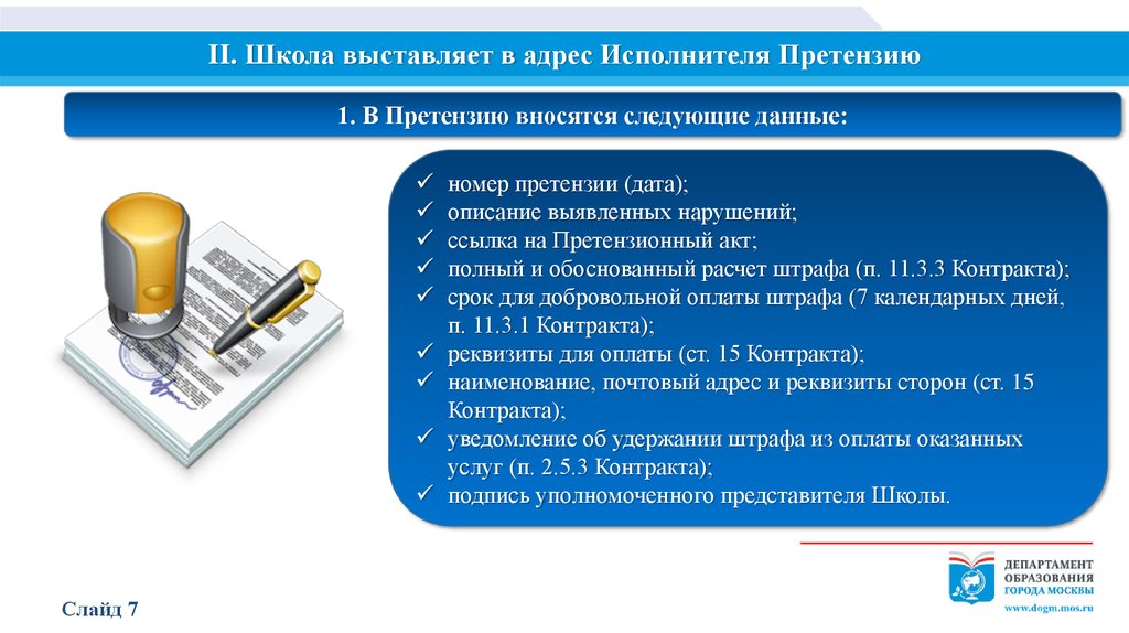 II. Школа выставляет в адрес Исполнителя Претензию1. В Претензию вносятся следующие данные: