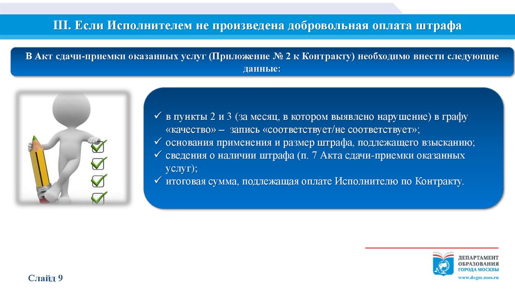 III. Если Исполнителем не произведена добровольная оплата штрафаВ Акт сдачи-приемки оказанных услуг (Приложение № 2 к Контракту) необходимо внести следующие