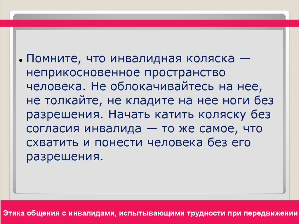 Помните, что инвалидная коляска —неприкосновенное пространство